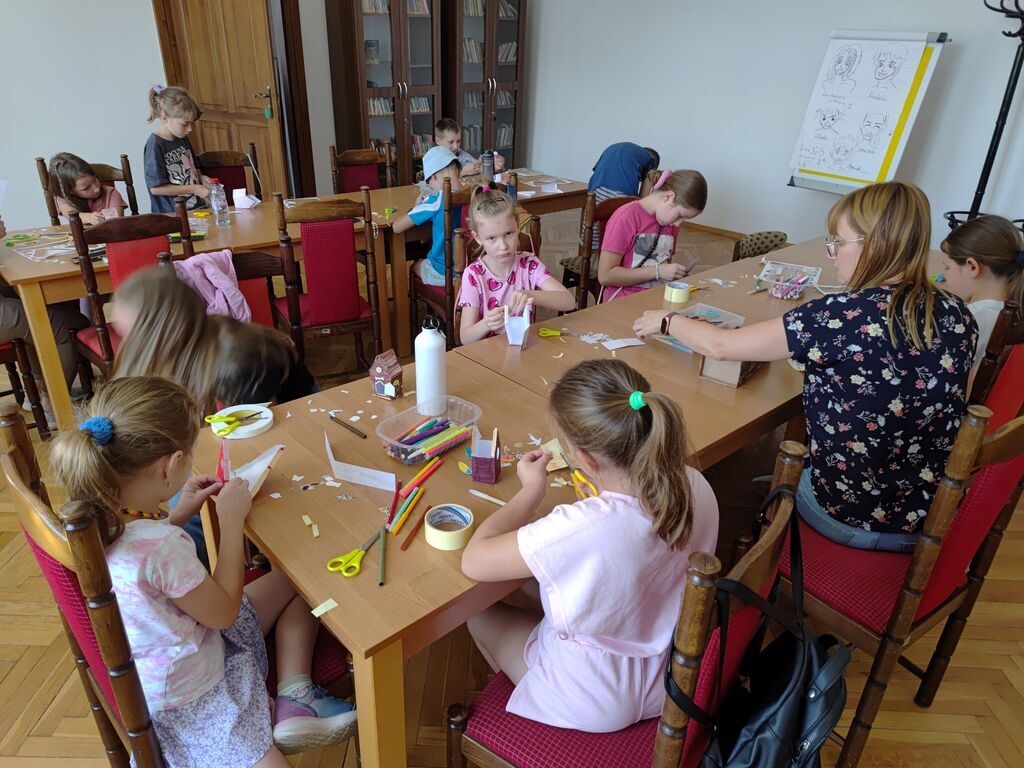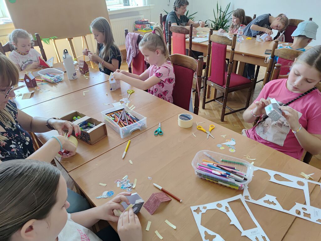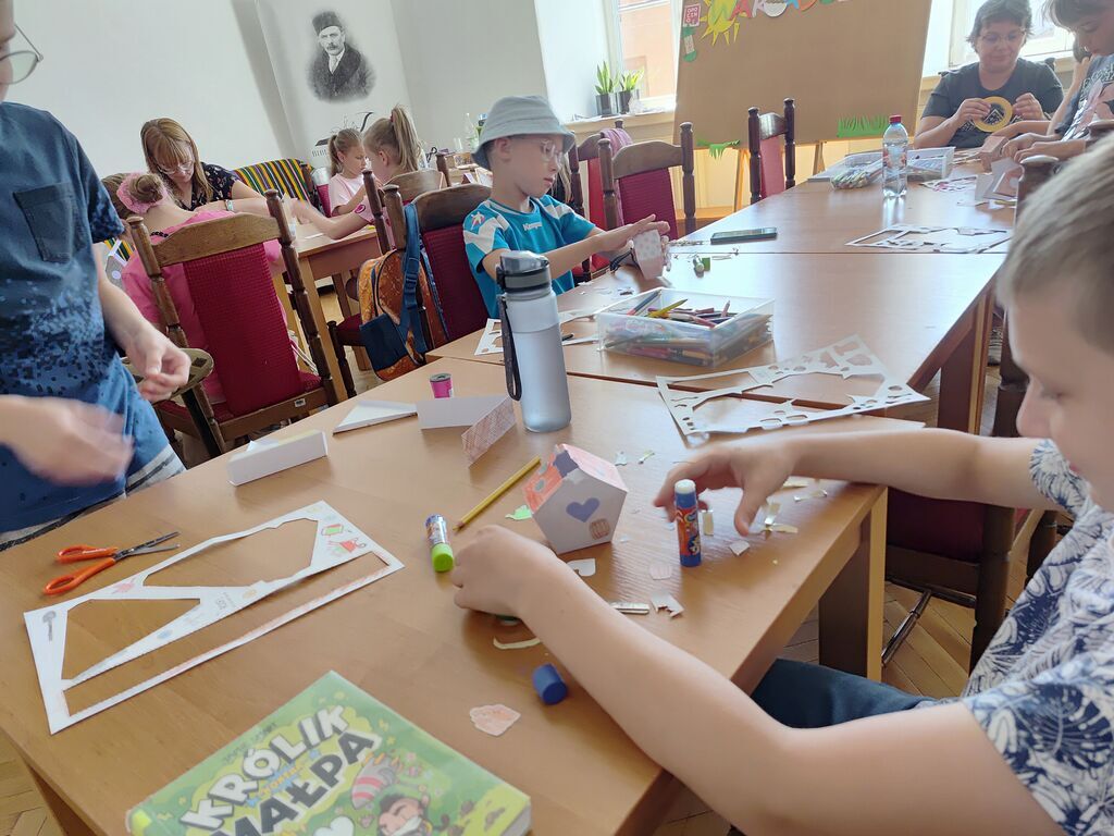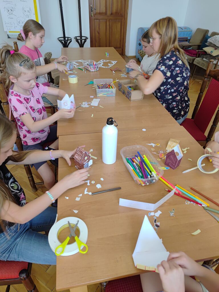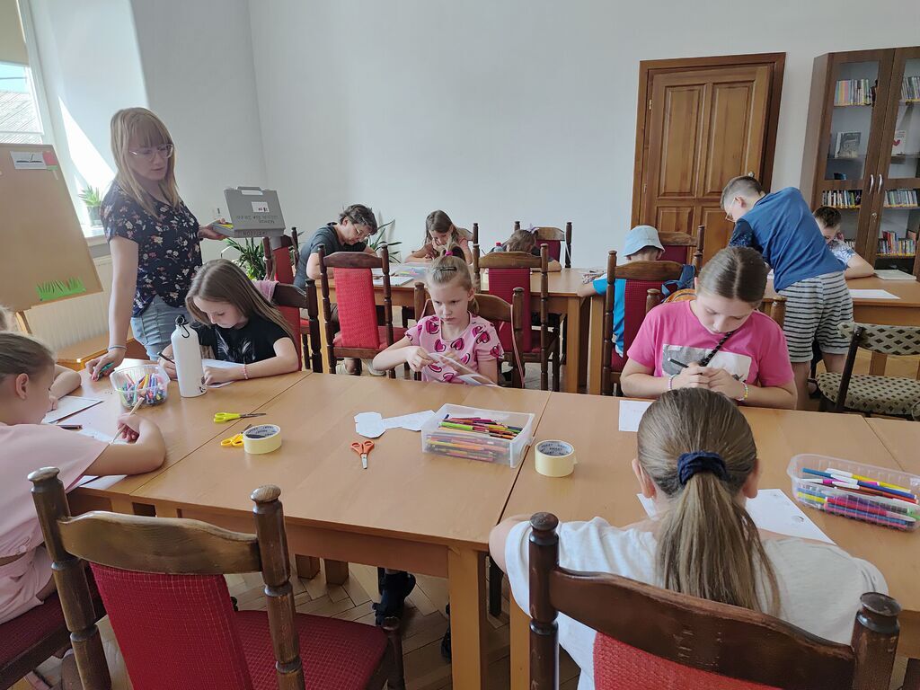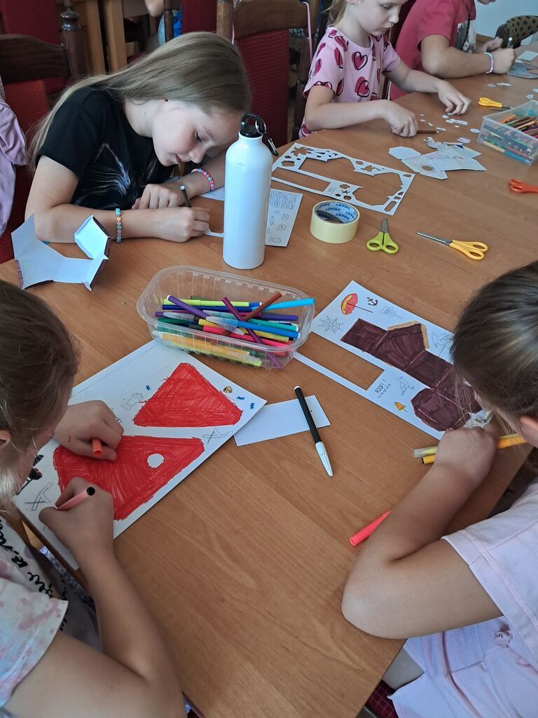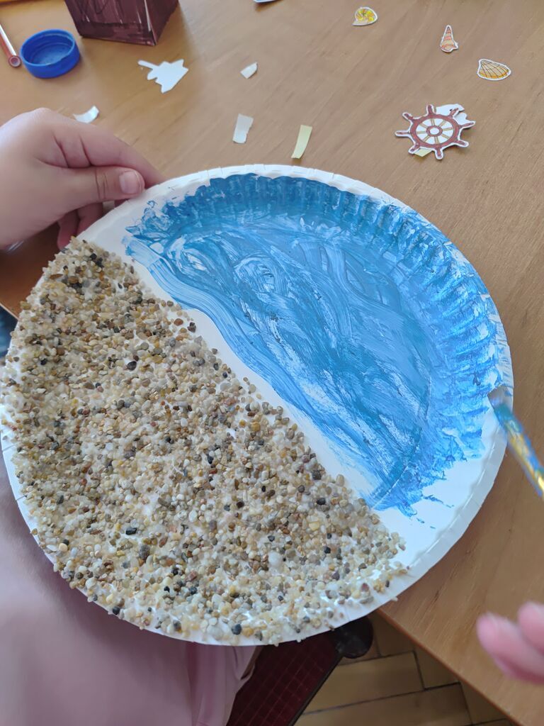 Podczas spotkania uczestnicy wykonywali prace przestrzenne przedstawiające plażę na papierowych talerzykach. Do tworzenia wykorzystano różnorodne materiały plastyczne, takie jak: piasek, bibułę, papier kolorowy oraz elementy dekoracyjne. Dzieci z dużym zaangażowaniem i pomysłowością projektowały swoje miniaturowe nadmorskie pejzaże, nadając im indywidualny charakter.