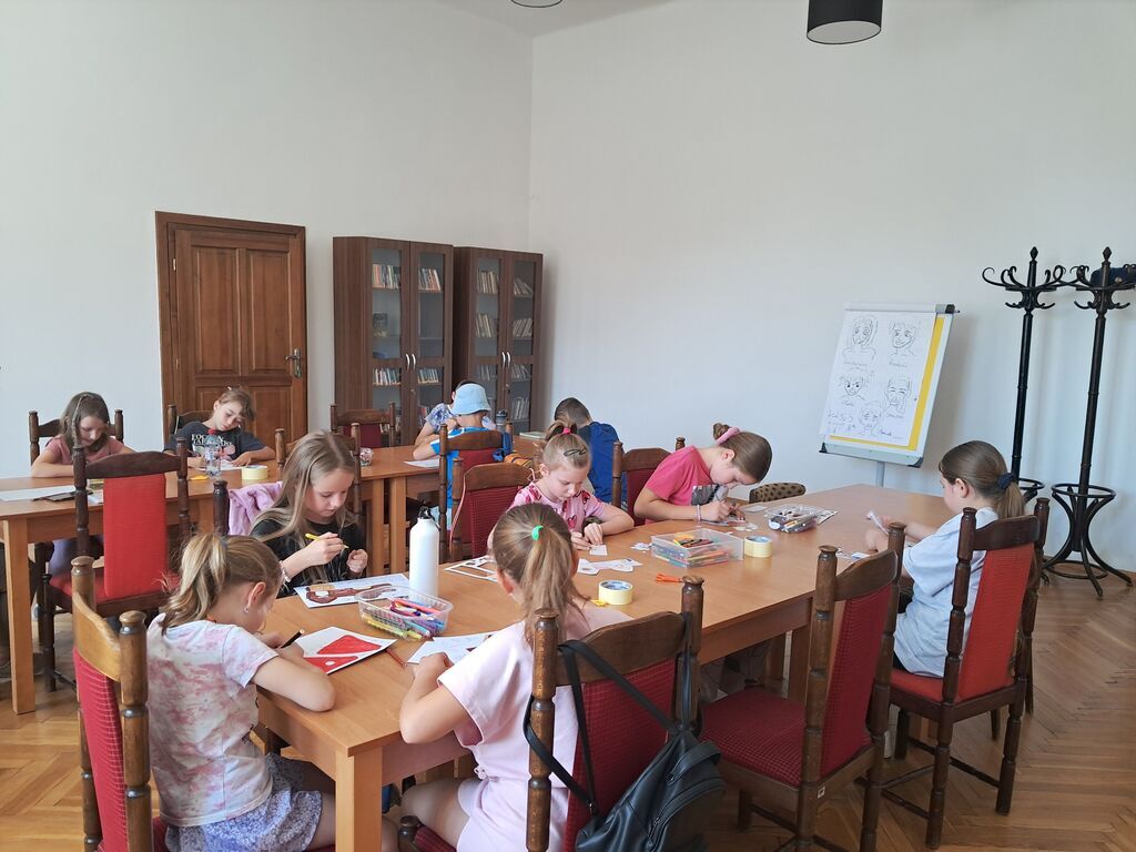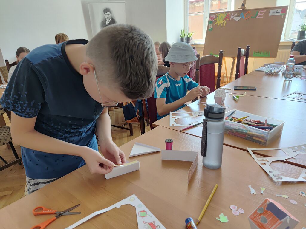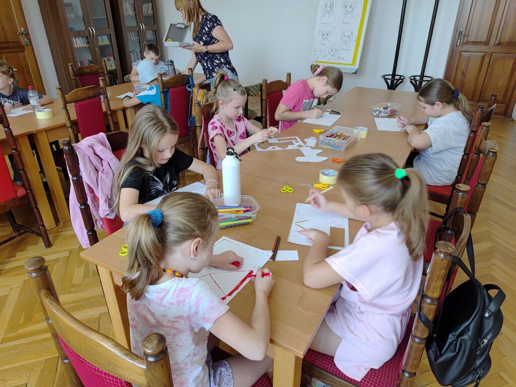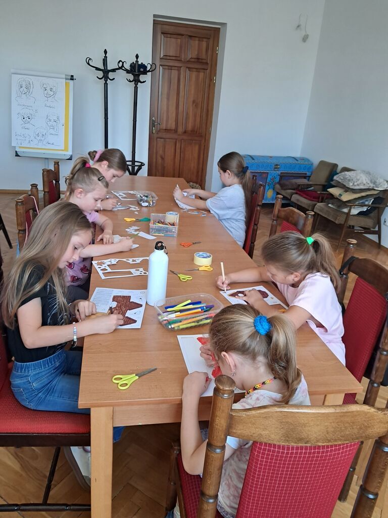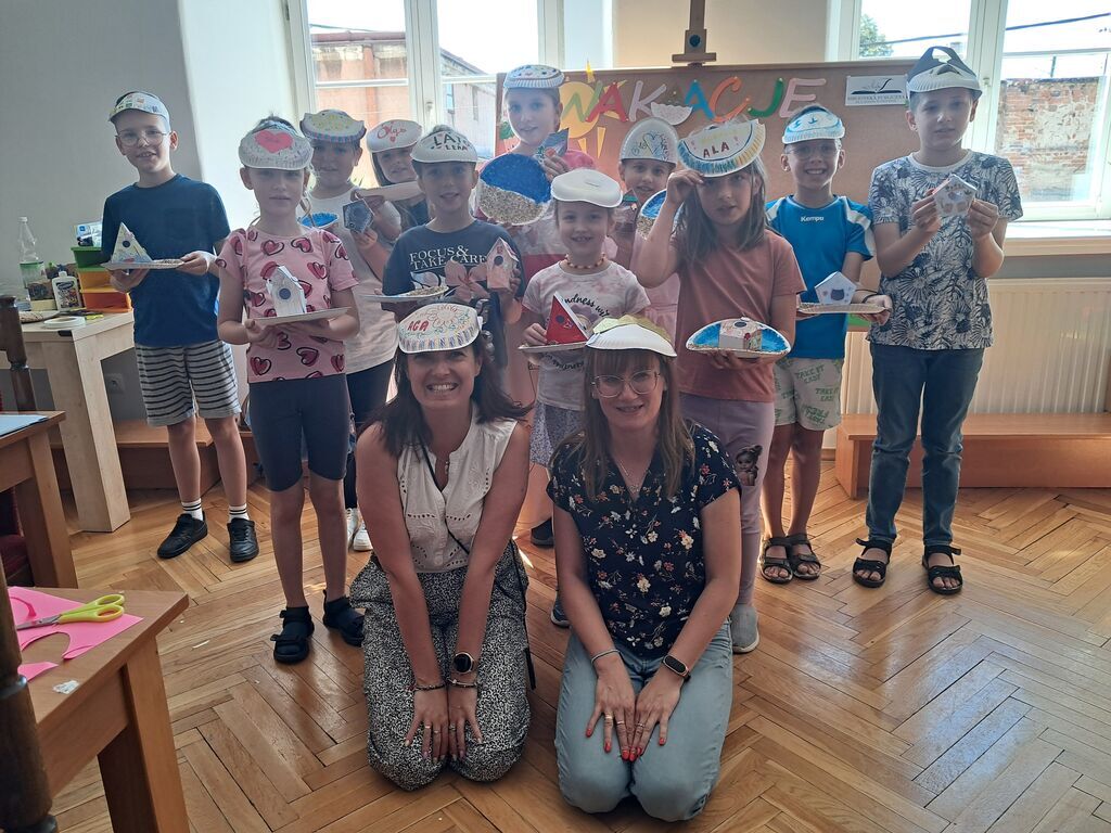 Drugim elementem zajęć było tworzenie daszków przeciwsłonecznych z papierowych talerzyków. Dzieci samodzielnie zdobiły je według własnego uznania, nadając im barwne, wakacyjne wzory. Gotowe prace można było przymierzyć, a następnie zabrać do domu jako praktyczną i radosną pamiątkę.